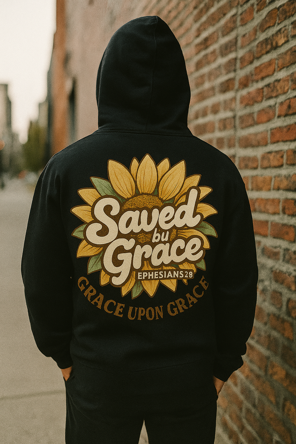 Wrap yourself in faith, comfort, and meaning with our Saved by Grace – Grace Upon Grace Hoodie. Featuring a warm sunflower design and bold hand-lettered typography, this hoodie is a reminder of God’s unearned love and daily mercy. Inspired by Ephesians 2:8, it speaks truth without saying a word—perfect for everyday wear, church, or gifting.
